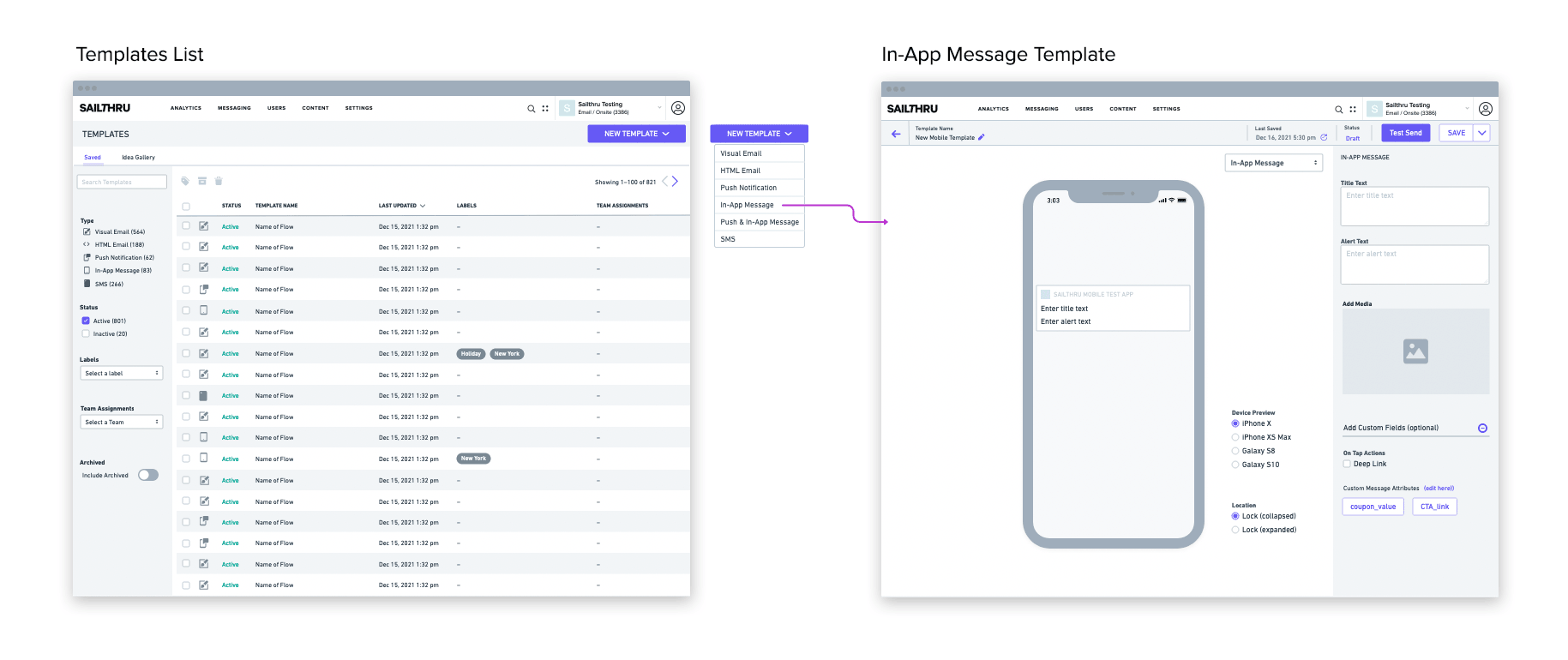 The three mobile template types were In-App Message, Push Notification, and a combined Push Notification & In-App Message. Users needed the ability to easily switch between the three and easily change/reverse decisions if needed.